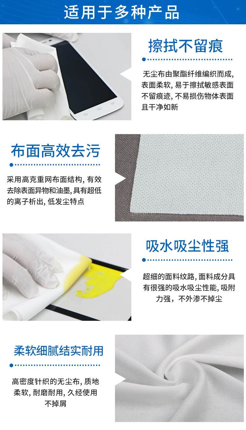 采用涤纶无尘布,涤纶(聚酯纤维)具有抗皱性、保形性好、强度高、弹性恢复能力强等特点,适合清洁油污、水渍等场景。¥ 0.00立即购买